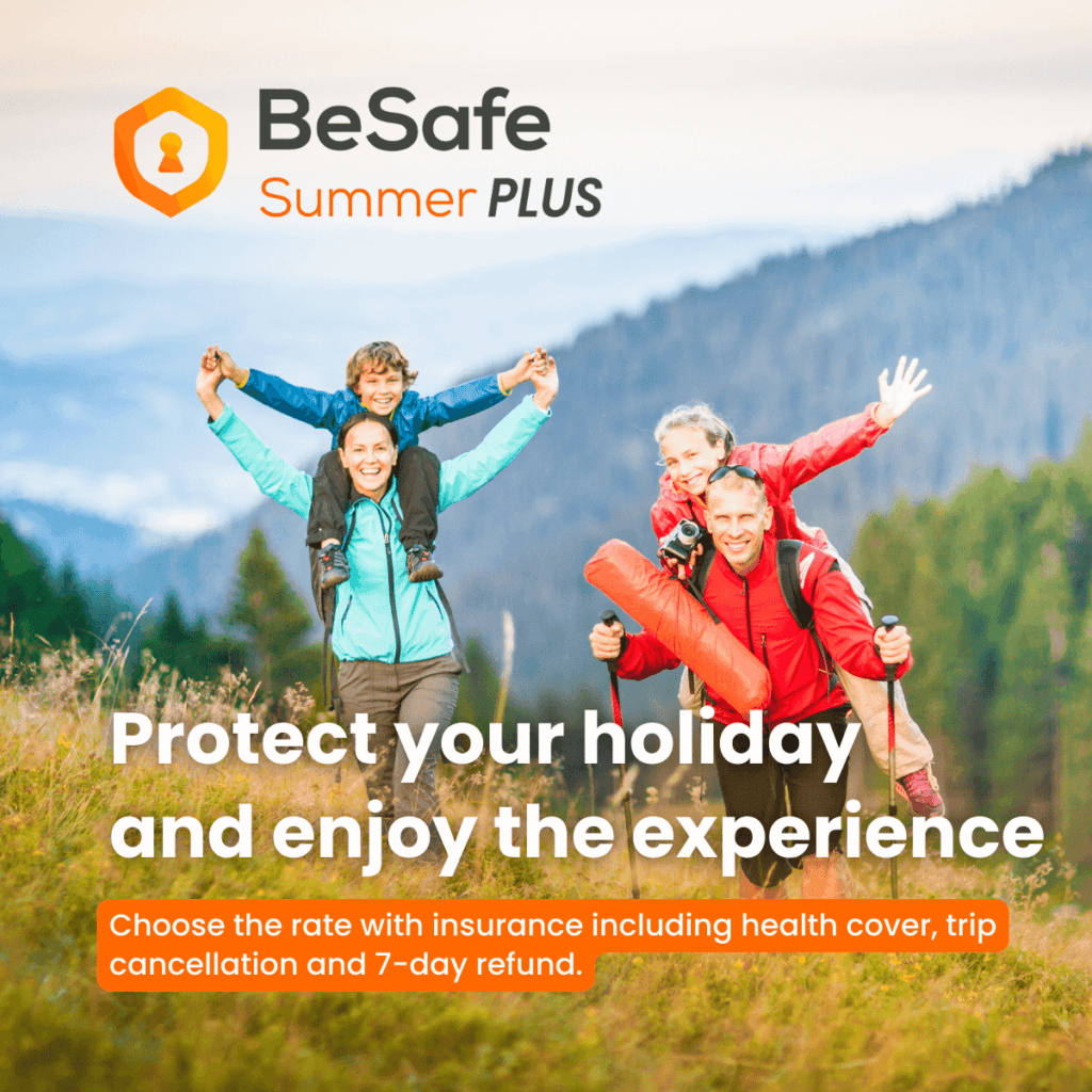 Entscheiden Sie sich für BeSafe Summer Plus, den Tarif mit eingeschlossener Versicherung, die Sie vor und während Ihres Aufenthalts schützt und es Ihnen ermöglicht, Ihre Reise zu stornieren und Ihre Rückerstattung innerhalb von nur 7 Tagen zu erhalten!